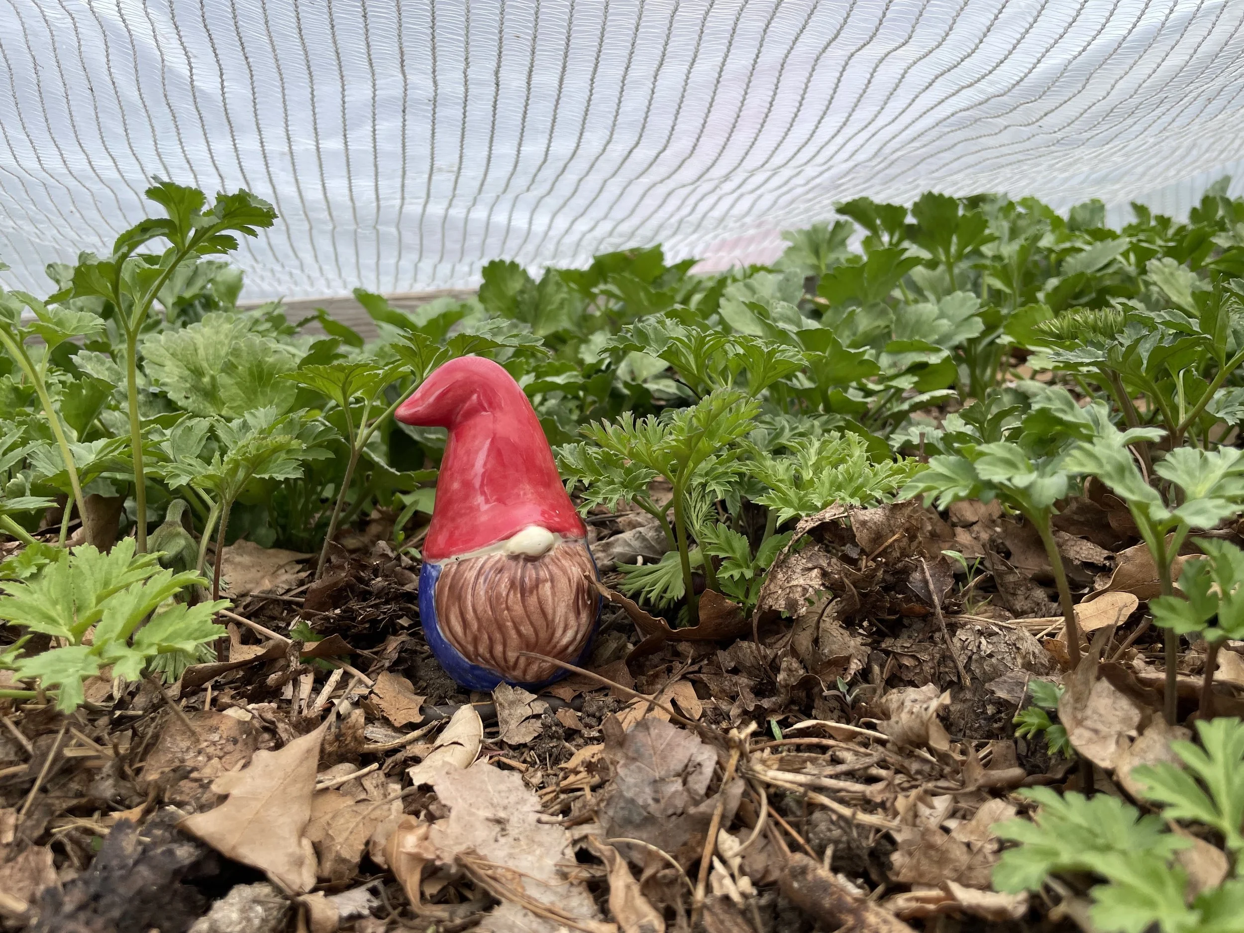 Even with this “constant vigilance” (Harry Potter reference anyone?), it’s an exciting time. Watching the plant’s foliage go from microscopic to a leafy bush brings much needed relief from the long dull winter days. Here are the adolescent plants that will hopefully bring you some beautiful bouquets in a month or two! My little garden gnome Ferdinand (another children’s book reference to a certain flower loving bull!) wanted to jump in the picture to give you some scale.